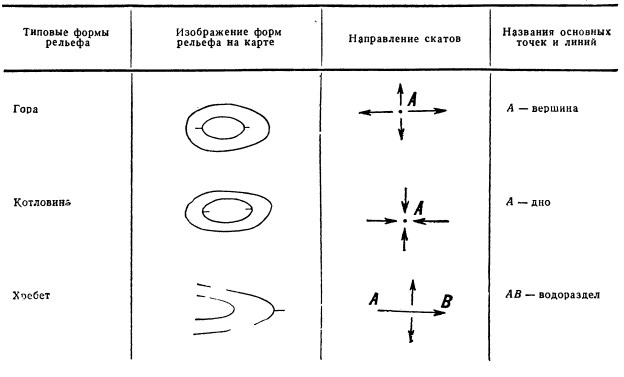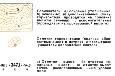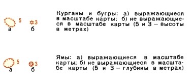 Отдельные элементы рельефа, имеющие определенный внешний вид на картах изображаются горизонталями.