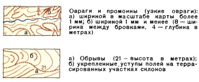 Детали рельефа естественного происхождения (обрывы, овраги, скалы, осыпи и т. п.) на картах изображают условными знаками коричневым цветом, а искусственного (насыпи, выемки, карьеры и т. п.) — черным цветом. Высота сечения рельефа — расстояние между двумя смежными основными горизонталями по высоте. Чем ближе друг к другу горизонтали тем круче склон. На топографических картах СССР масштаба 1:50 000 высота сечения 10 метров, масштаба 1:100 000 высота сечения 20 метров.