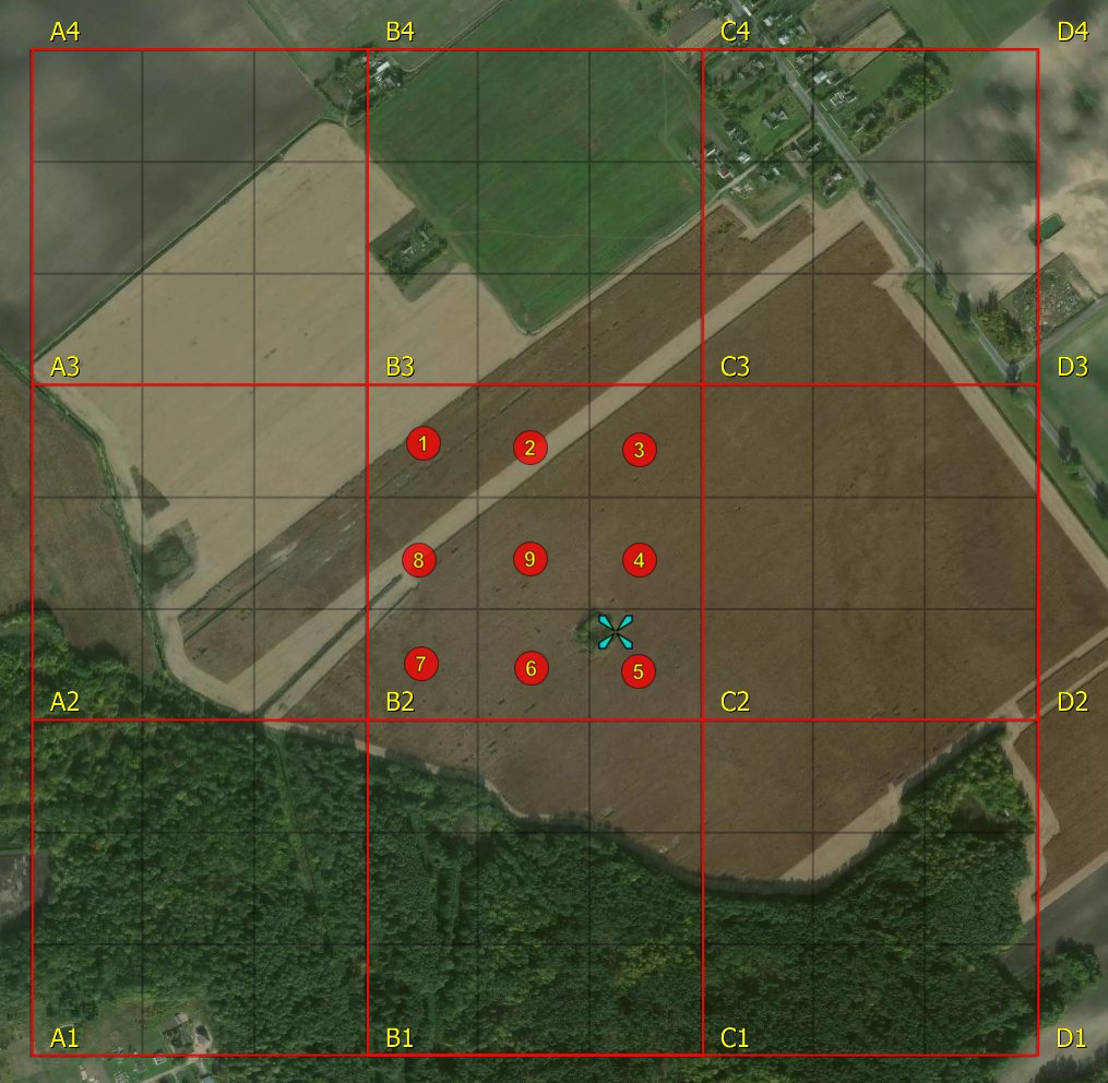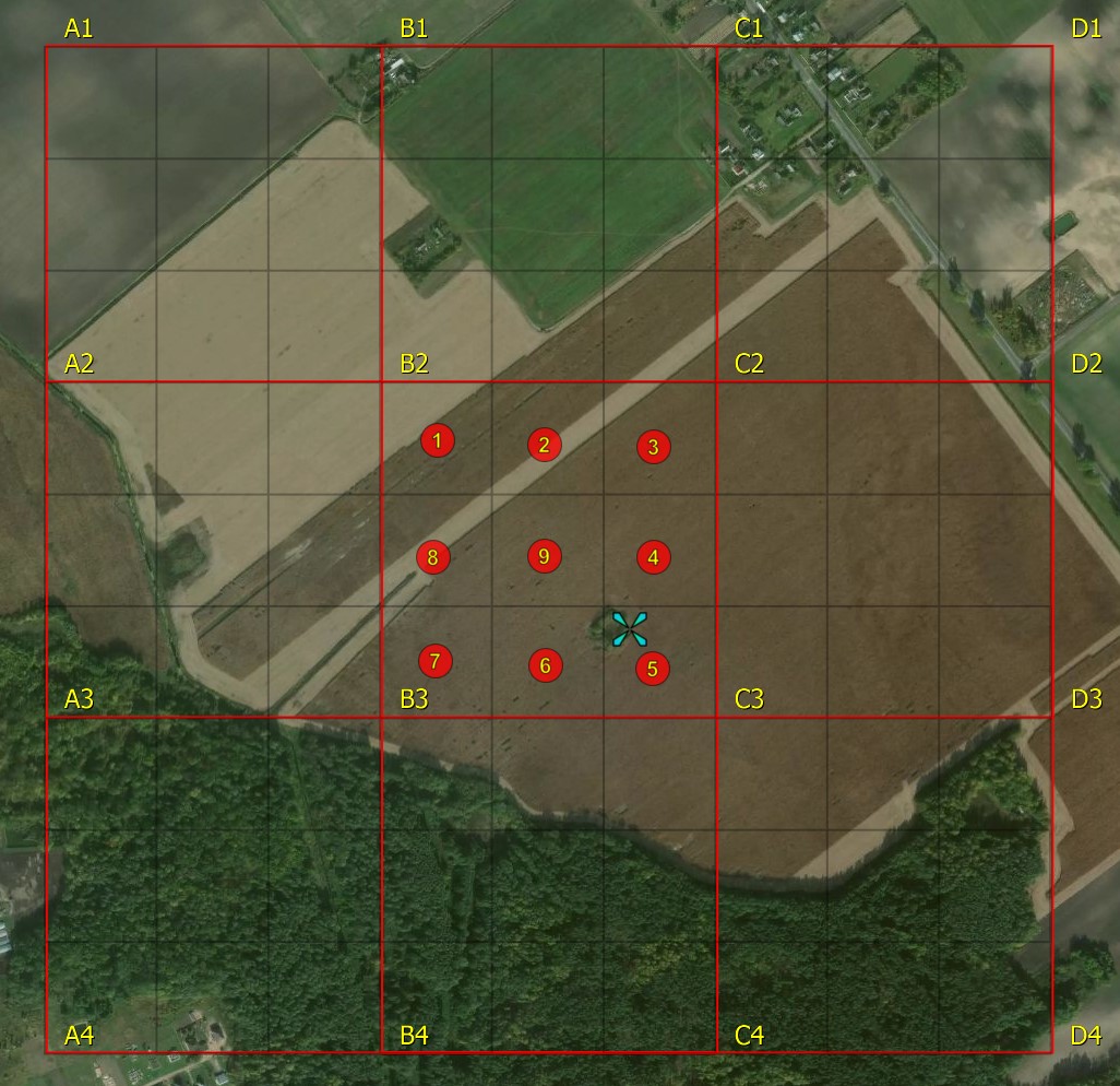Если необходимо уточнение местоположения, квадрат мысленно делится на девять частей используя военную общепринятую методику и целеуказание дополняется.